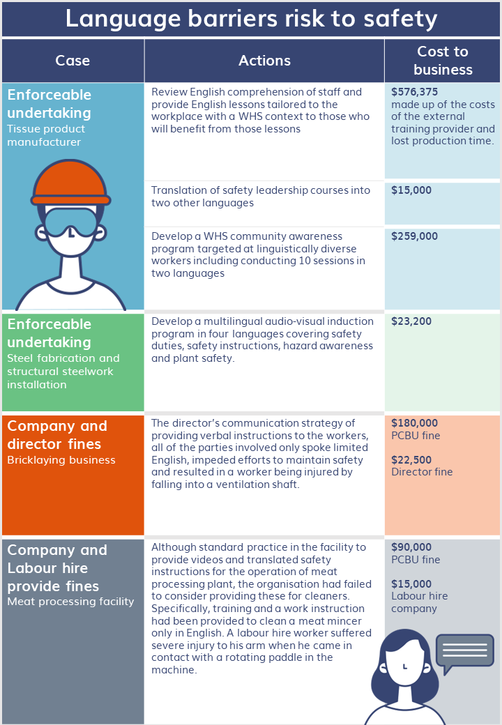 In the last few years, there have been cases where a language barrier has posed serious risk or injury, resulting in either a fine or an enforceable undertaking being imposed on the business. Looking at the case studies to the right, there are many examples of where language barriers were considered significant enough for expensive enforceable undertakings or PCBU fines.